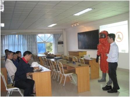 2013年11月22日,我司邀請法國代爾塔(中國)安全防護有限公司高級培訓師韓偉嘉先生為我司員工講解如何正確穿戴使用法國代爾塔氣密外置重型防化服,參加這次培訓的人員主要來自水廠維護部與米鋪水廠,共計26人。