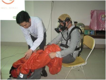 韓偉嘉培訓師介紹到法國代爾塔公司生產的重型防化連體服是由聚脂纖維制作而成,雙面涂層為防火面料,代爾塔獨特的剪裁方式使接縫數量達到最低,密封拉鏈由胯下延伸到圍繞頭部一周,組件和內貼接縫經過內部和外部的雙硫化,可以密封接縫。通過可移動緊收配套裝置可將標準尺碼的安全靴和標準尺碼的手套整合到連體服上,同時配有不可旋出手套。呼吸面罩的組裝系統(tǒng)和多數市面上的面罩可配套使用,方便更換。