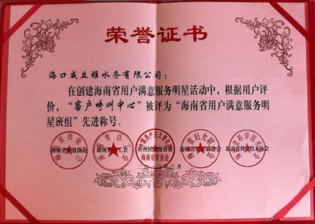 “海南省用戶滿意服務(wù)明星班組”榮譽(yù)證書