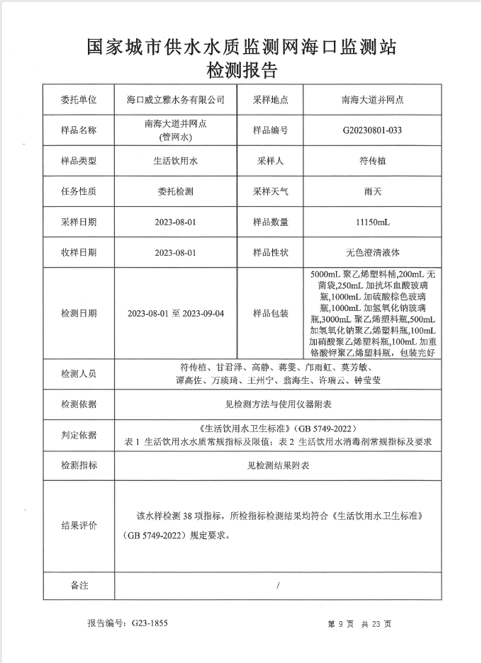 2023年8月??谕⒀潘畡沼邢薰竟芫W(wǎng)水水質(zhì)檢測月檢報告