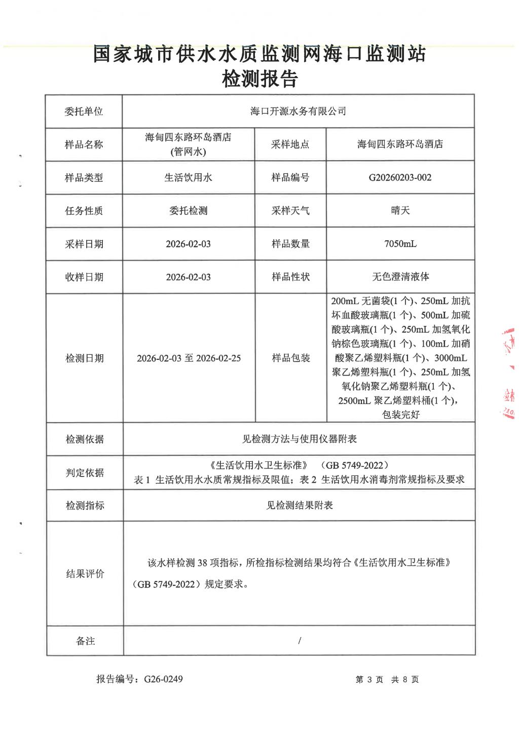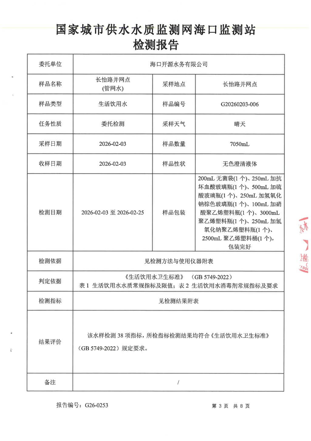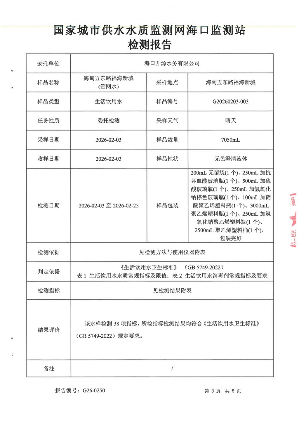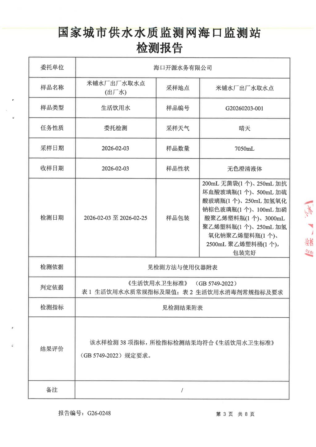 2026年2月開源水務(wù)有限公司米鋪水廠出廠水、管網(wǎng)水月檢報告