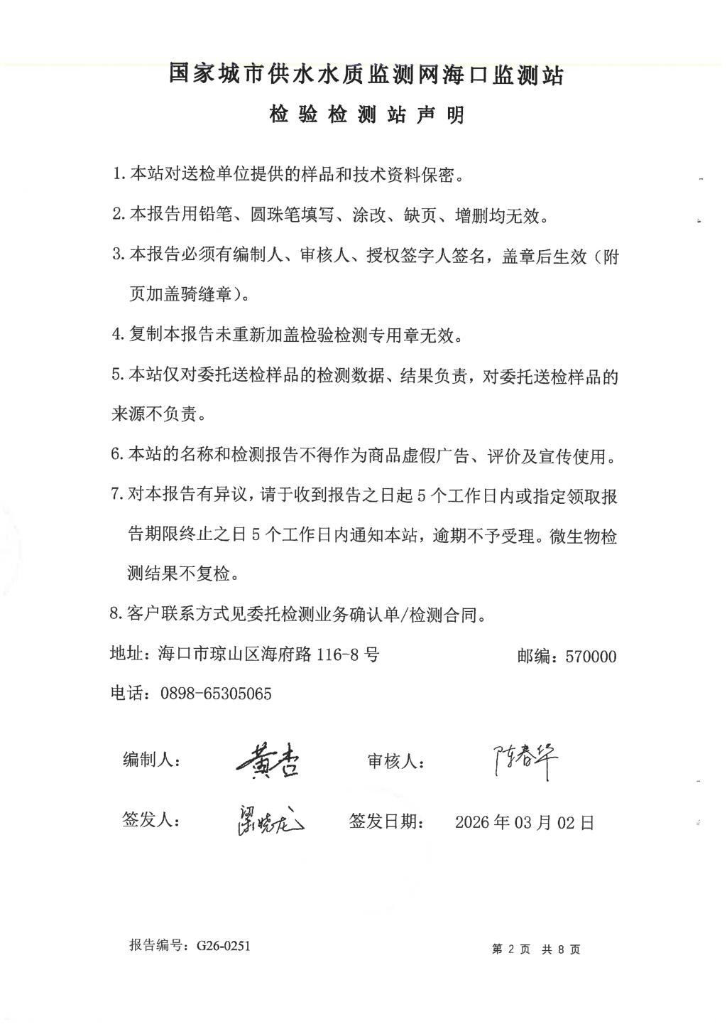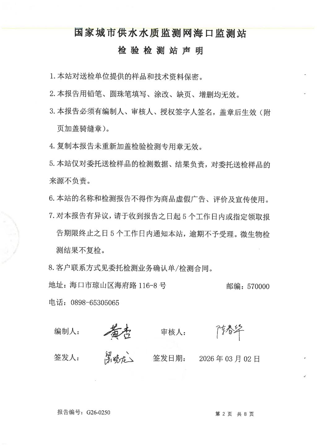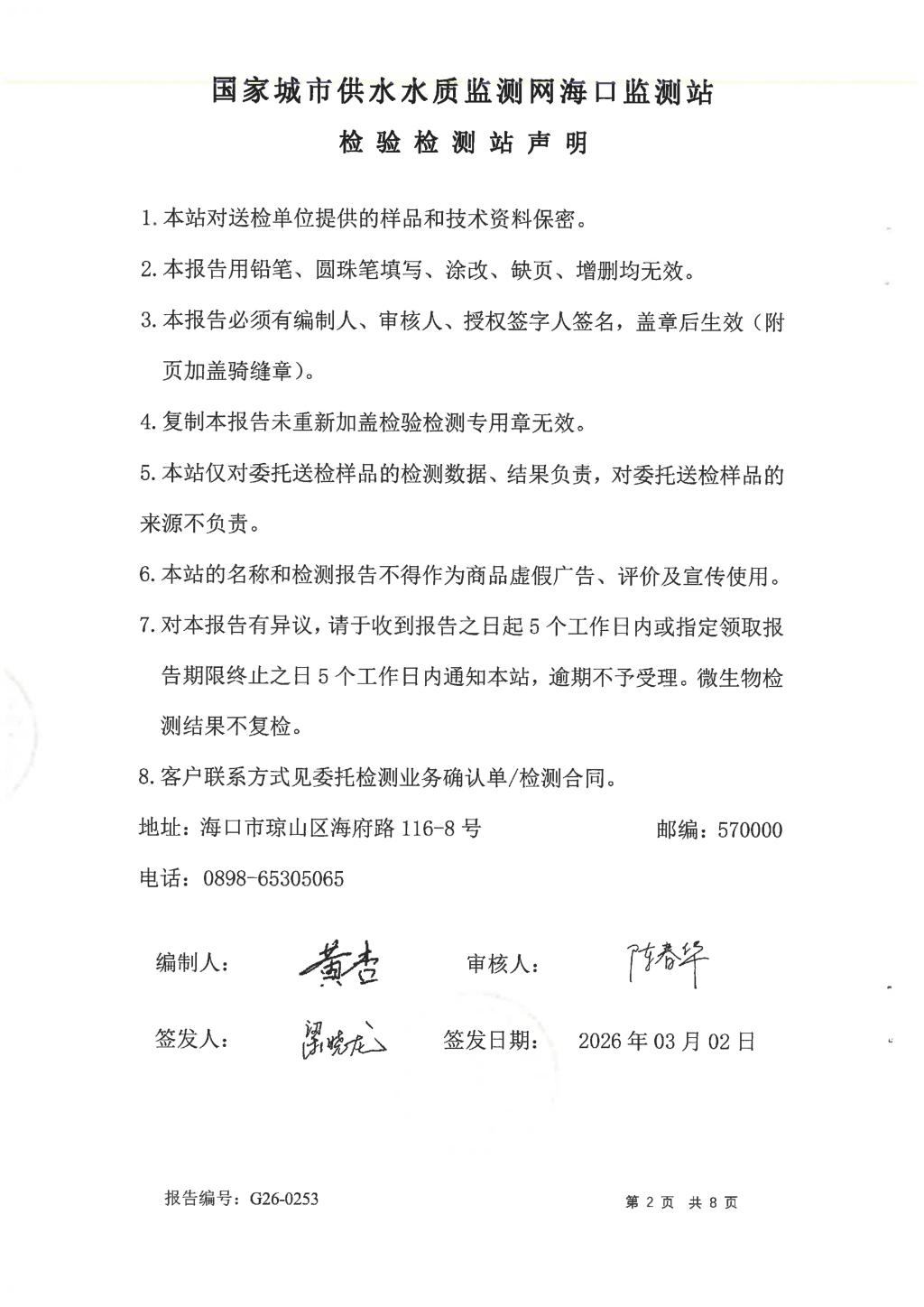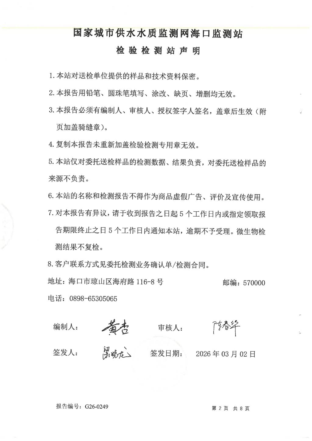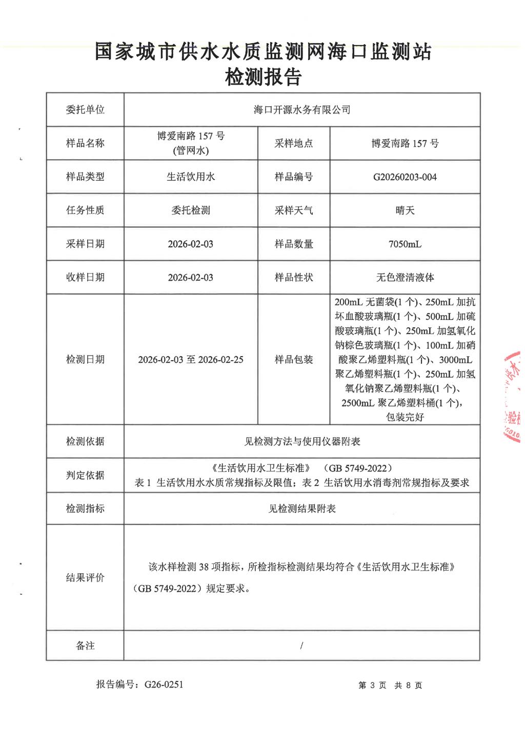 2026年2月開源水務(wù)有限公司米鋪水廠出廠水、管網(wǎng)水月檢報告