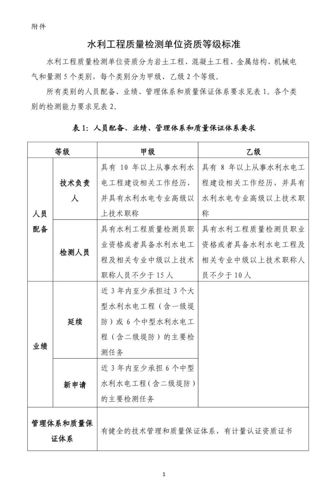 水利工程質(zhì)量檢測(cè)單位資質(zhì)等級(jí)標(biāo)準(zhǔn)自印發(fā)之日起施行,其中檢測(cè)能力要求中新增項(xiàng)目和參數(shù)于2019年水利工程質(zhì)量檢測(cè)單位資質(zhì)審批時(shí)使用。