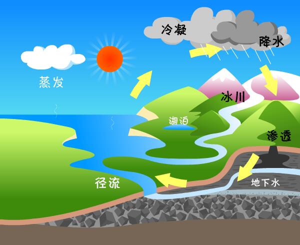 水循環(huán)沒(méi)有起點(diǎn),但是海洋是一個(gè)開(kāi)始水循環(huán)的好地方。太陽(yáng)驅(qū)動(dòng)著整個(gè)水循環(huán),首先使海洋里的水升溫,一部分水變成水蒸氣,蒸發(fā)到空氣中。淡水湖和江河中同樣也存在著蒸發(fā)現(xiàn)象。在陸地上,從植物和土地上蒸騰的水分同樣也變成水蒸氣,蒸發(fā)到空氣中??諝庵猩倭康乃畞?lái)自于升華,也就是由冰和雪直接蒸發(fā)變成水蒸氣,完全省略了融化過(guò)程。上升的氣流將水蒸氣帶到大氣層中,在大氣層中由于溫度較低,水蒸氣又凝結(jié)后變成云。氣流驅(qū)使著云圍繞地球運(yùn)動(dòng),云顆粒互相碰撞、不斷擴(kuò)大并且變成降水從空中落下。有些水分以雪的形式降落,可堆積變成冰帽和冰川。當(dāng)春回大地氣候變暖時(shí),雪通常會(huì)融化,積雪融水沿地面形成融雪徑流。雖然大部分降水都回到海洋,但仍有一些降落到了陸地上,由于地心引力,沿地表流動(dòng)形成地表徑流。